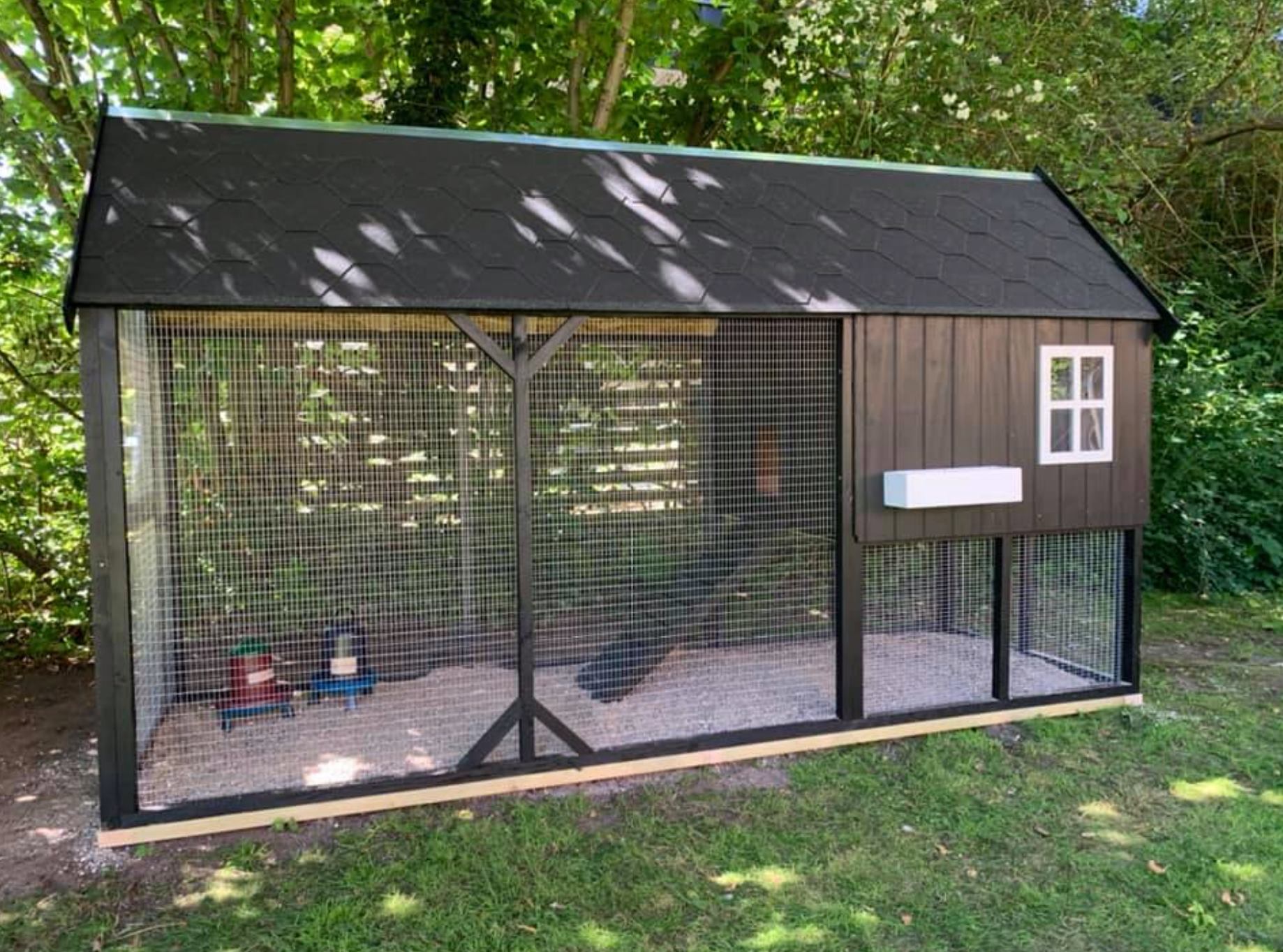 Hønsehus Sort Kobber Maran er en af vores basic modeller til mindre hønsehold i haven (3-7 høns). Måler 110 x 315 cm